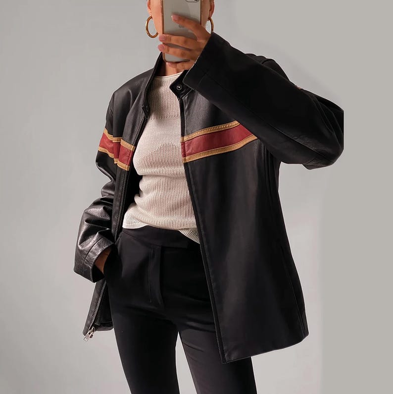 Turn heads with bold retro energy. Our bestselling 1980s-inspired oversized black leather jacket with red and yellow shoulder stripes is crafted from 100% real full-grain leather and built for style, comfort, and attitude.