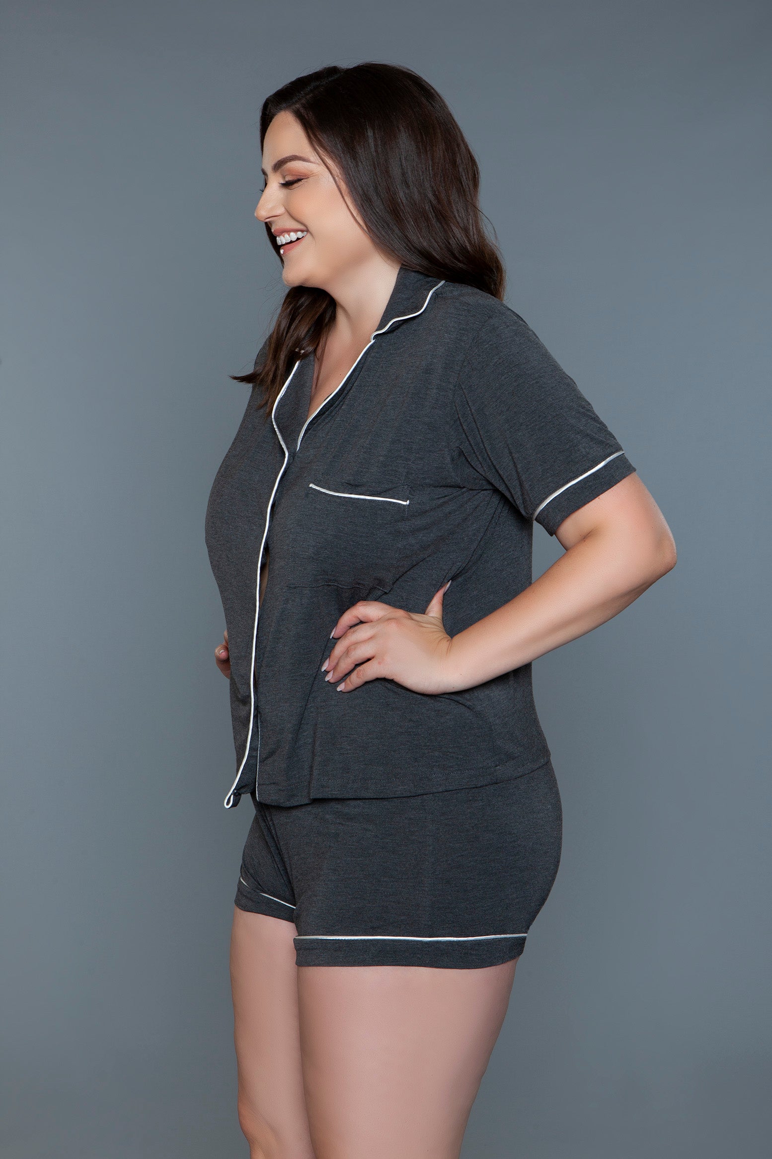 The Riley Pajama Set offers a classic and comfortable look, crafted from soft fabric for a cozy feel. This two-piece set includes a collared, short-sleeve shirt with a button-down front, a chic chest pocket, and refined piping detail along the edges for a touch of elegance. Paired with matching shorts featuring an elastic waist, this set is perfect for lounging or a restful night's sleep, combining style with ease. Notched collar Short sleeves Button-down closure Pocket on the chest Elastic waist Contrast decorative piping