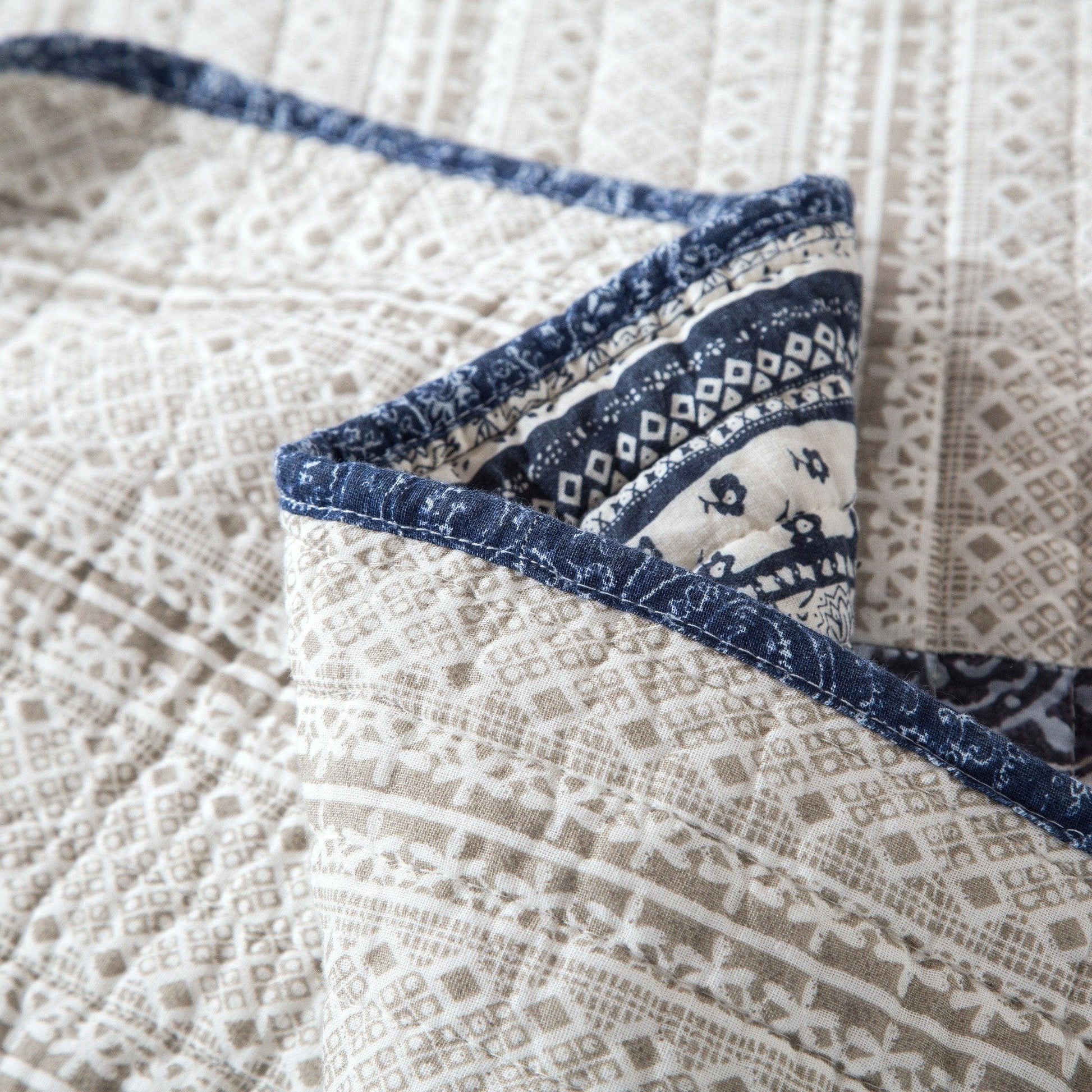 Accented with multiple floral paisley square patchworks all over the bedspread dark navy blue, lighter denim blue, white and grey shades.