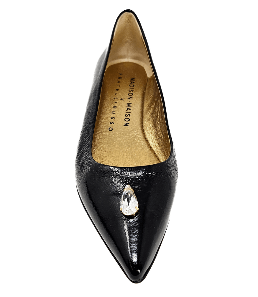 Elevate your everyday elegance with the Madison Maison Maira Ballet Flats. These exquisite flats showcase a sleek patent leather finish, delivering a timeless and polished aesthetic. The refined pointed toe design and subtle 1cm heel create a flattering silhouette, while a delicate crystal embellishment adds a touch of sparkle. Handcrafted in Italy, these flats embody exceptional craftsmanship and enduring style.