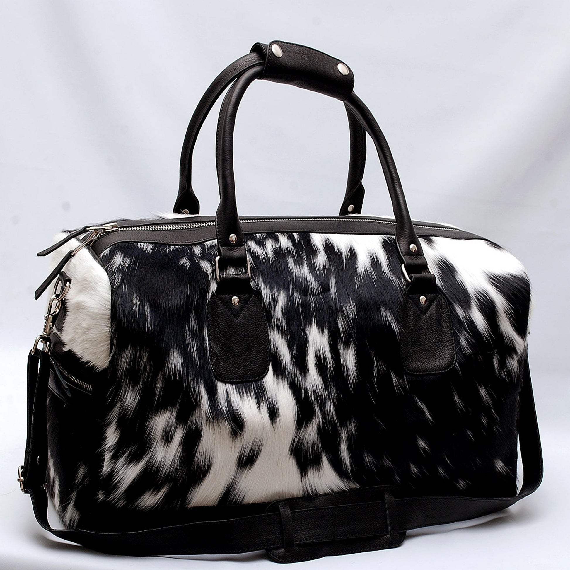 Made from high-quality, genuine cowhide leather, this duffel bag features a beautiful hair-on animal print that is both eye-catching and durable. The bag's spacious interior easily accommodates all your essentials, while the sturdy leather handles and detachable shoulder strap provide versatile carrying options. To ensure your belongings are safe and secure, the bag also includes a heavy-duty zipper closure and an inner pocket for added organization. To maintain the beauty and longevity of your cowhide duffel bag, we recommend spot cleaning with a damp cloth and avoiding exposure to direct sunlight or heat sources.
