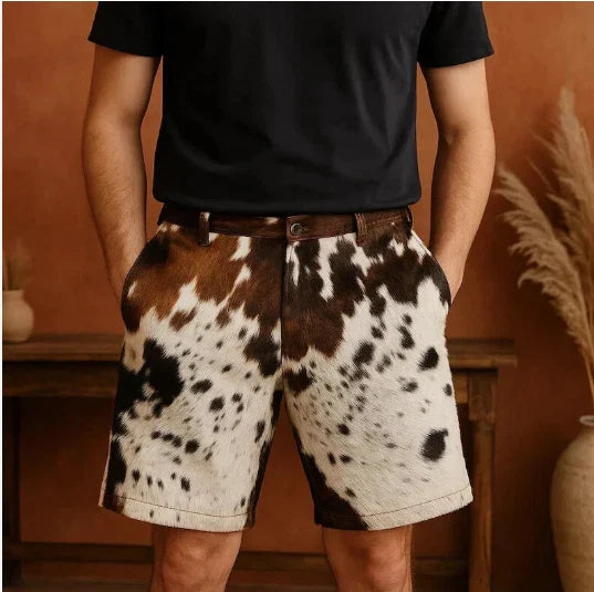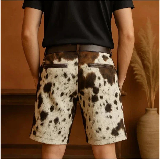Stand out with our Men’s Cowhide Hair-On Shorts, crafted from 100% genuine cowhide leather. These eye-catching shorts feature natural cow hair and bold cow print patterns, making them perfect for western fashion lovers, festivals, or casual statement outfits. Each pair is handmade, so you get a unique look with every piece.