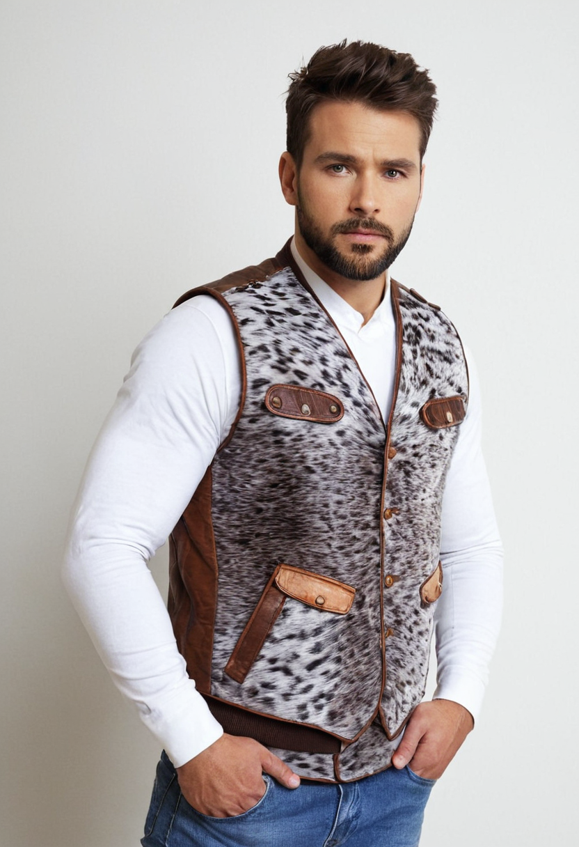 Indulge in luxury with our Men's Cowhide Hair On Pony Skin Vest. This premium piece features a refined cowhide hair exterior, adding a touch of sophistication to your wardrobe. The perfect addition to any outfit, its unique texture and exclusive design make a statement. Elevate your style with this one-of-a-kind vest.