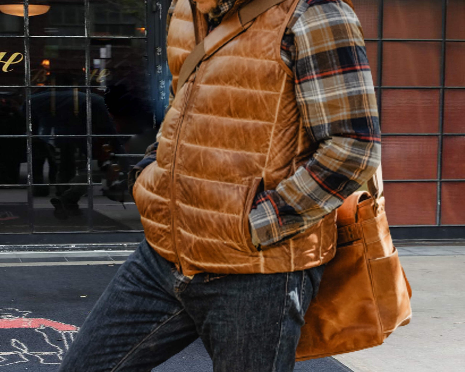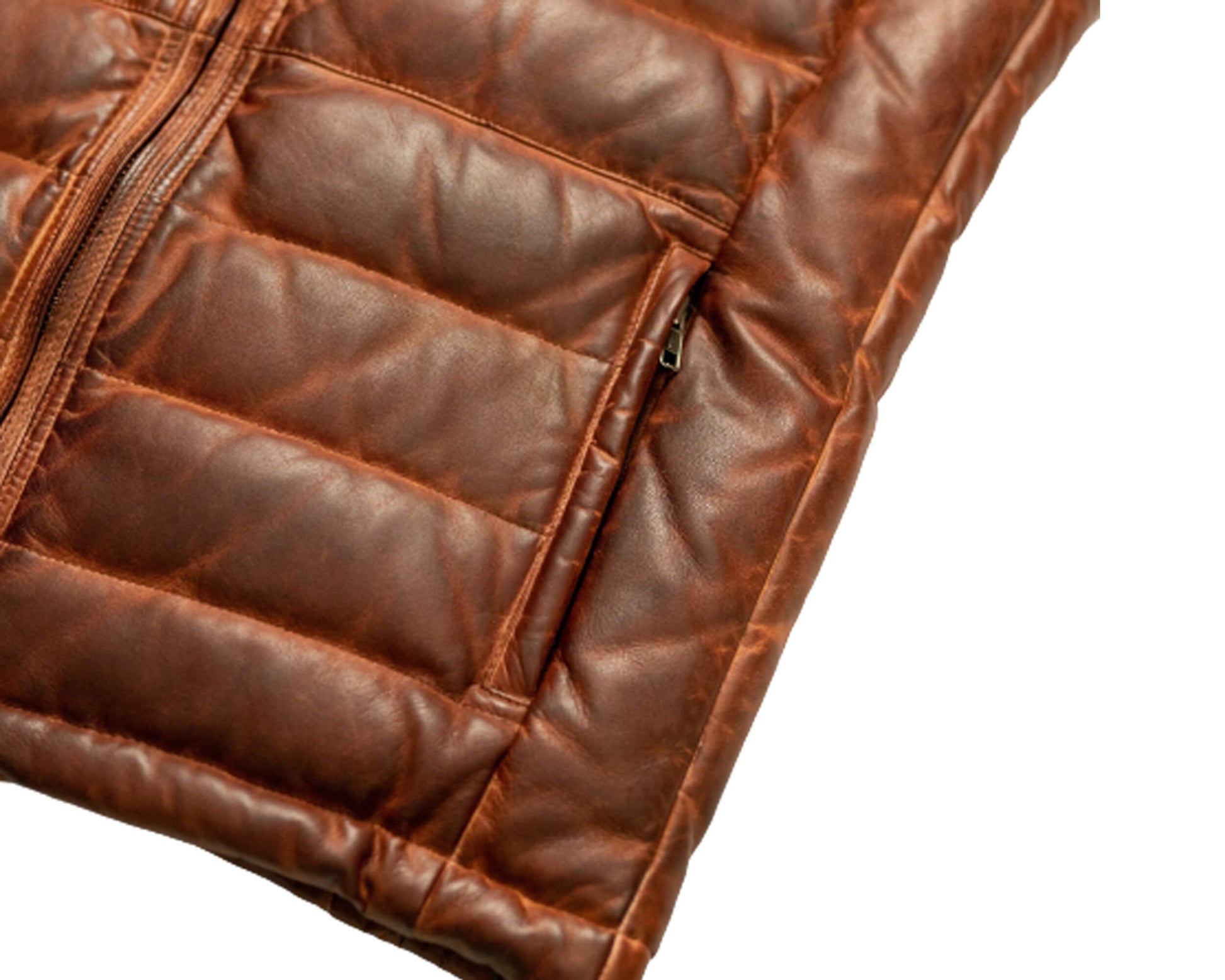 Transform your outfit with our luxurious Men's Leather Puffer Vest. This vest features a beautifully crafted leather design that adds an air of sophistication to any look. The puffer style ensures ultimate warmth and comfort, making it the perfect addition to your winter wardrobe. Elevate your style and stay warm in style with our Leather Puffer Vest.