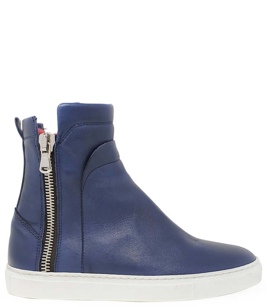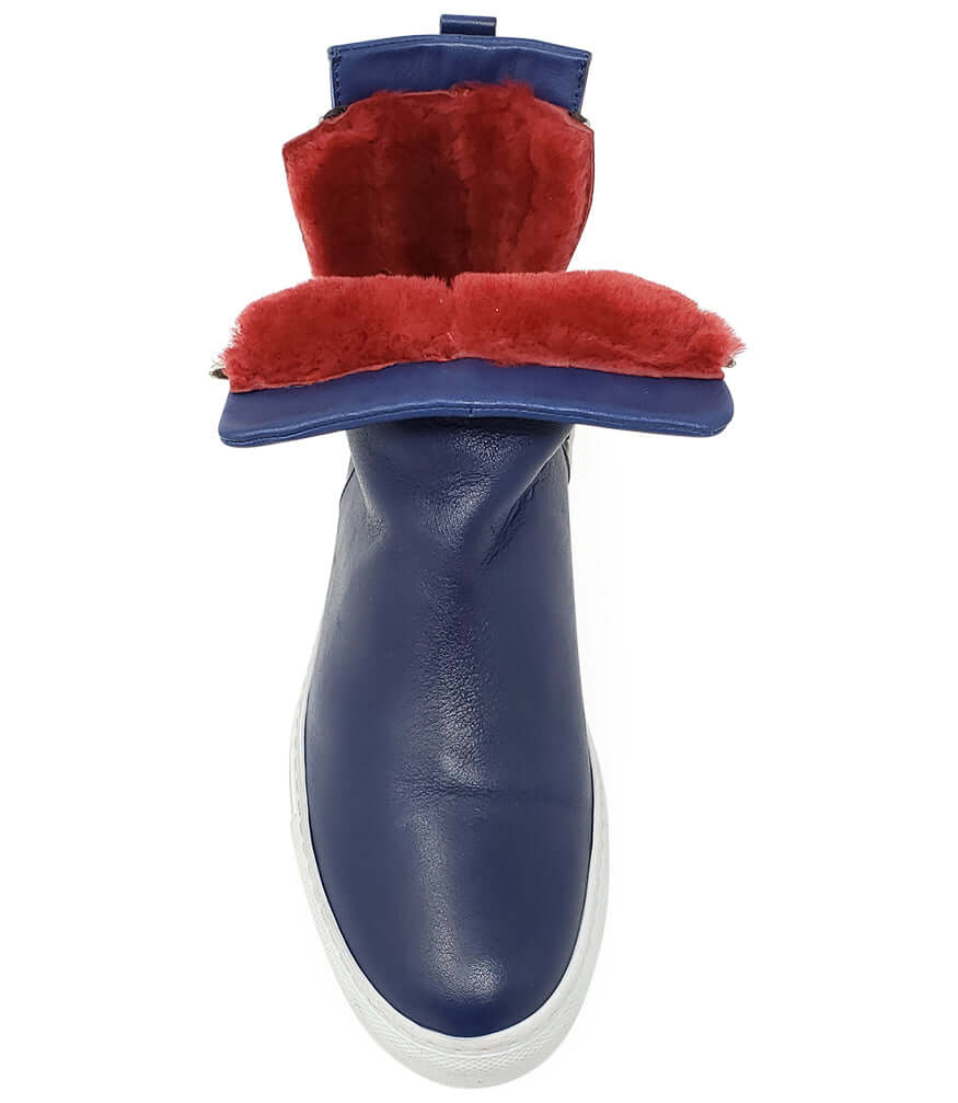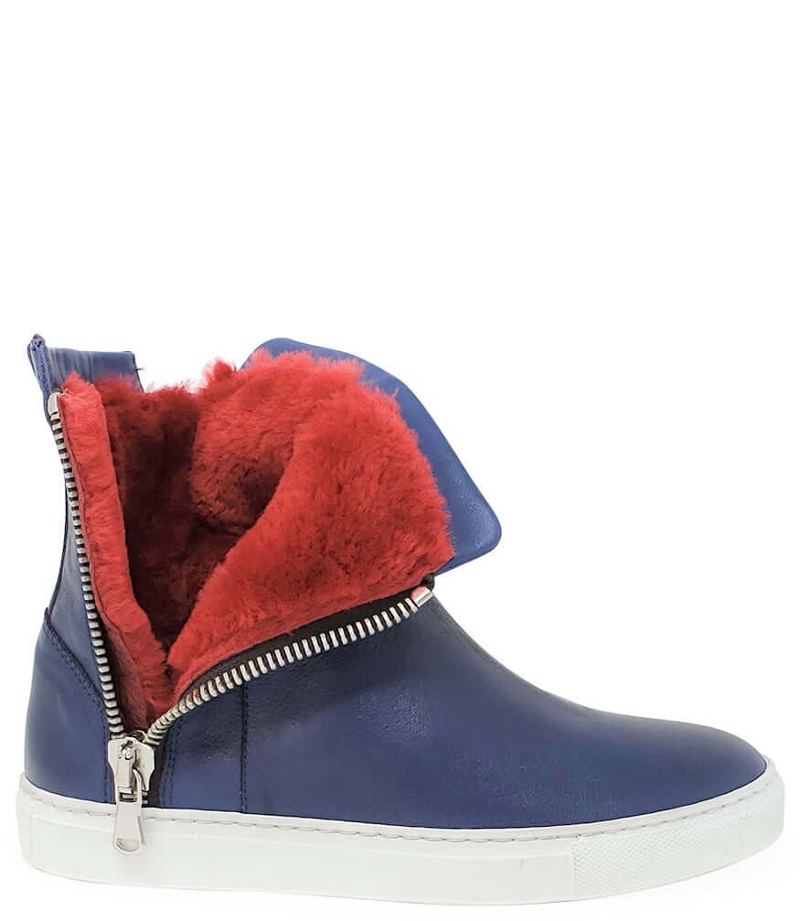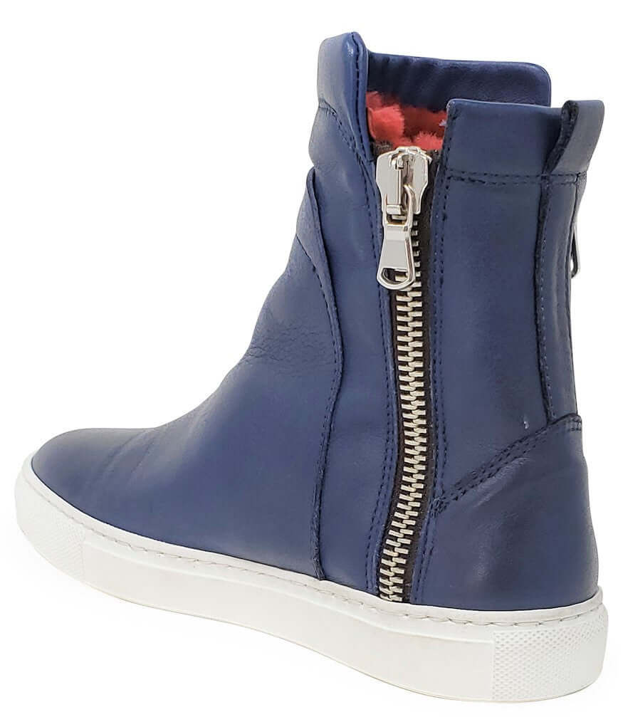 The Navy Leather Double Zip Shearling Sneaker, also known as the Madison Maison Hi-Top Sneaker, is a fashionable and comfortable shoe perfect for cold winter days. Made in Italy, this sneaker features a luxurious shearling lining and a durable rubber sole, with a 6.5 inch shaft and 1 inch heel. The leather and Shearling Lining adds a touch of elegance to this casual design