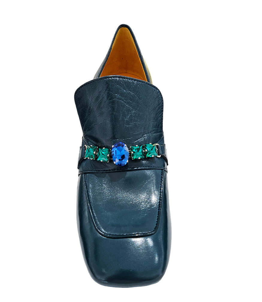 This handmade leather loafer provides a stylish, mid-height heel for comfortable wear. Crafted with the highest quality leather from some of Italy's best tanneries, this shoe features hand-cut glass jewels for added flair. Get the perfect mix of professionalism and glamour with the Madison Maison loafer.