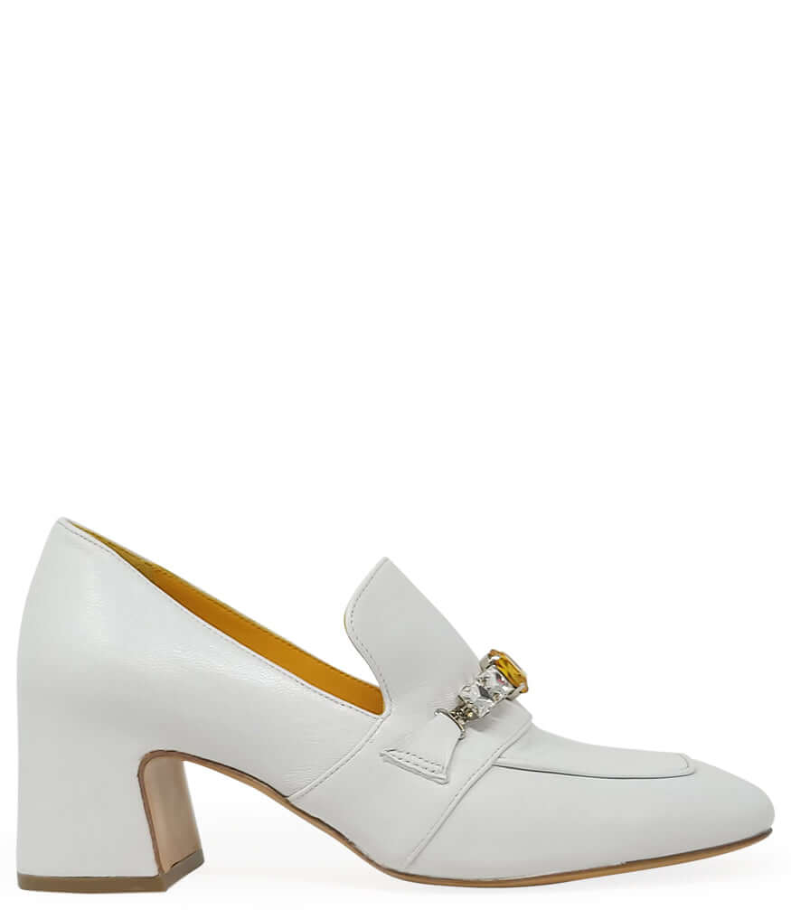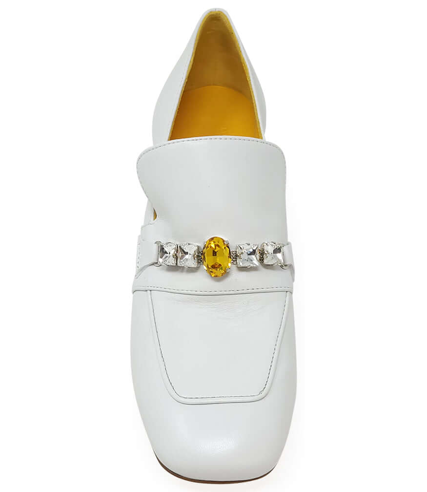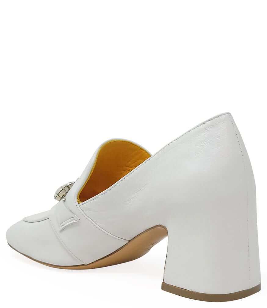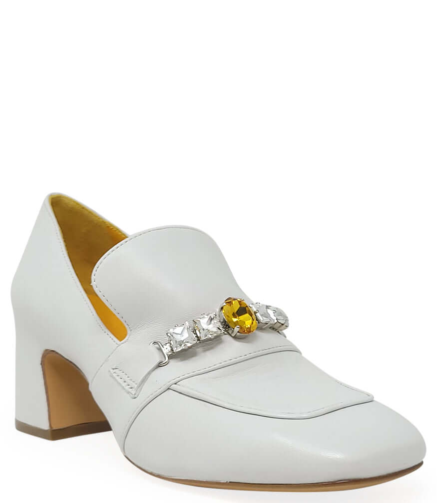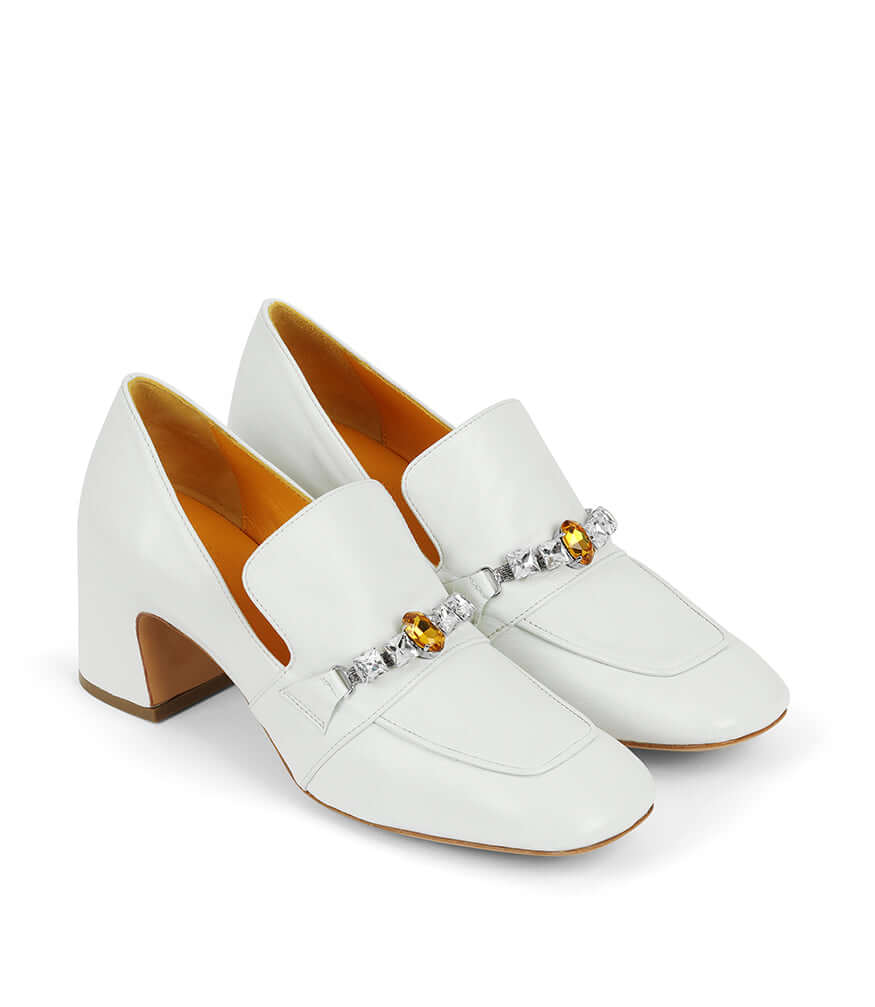 The Madison Maison White Leather Mid Heel Jeweled Loafer offers an exquisite combination of comfort and sophistication. Crafted with 100% leather and assembled through a 200 step sole process, these luxurious shoes boast a 0.5 in/ 1.27 cm mid heel and gold metal horse-bit detail for a truly timeless look. Handmade in Italy with the finest materials from the best tanneries, this elegant shoe will elevate any outfit.