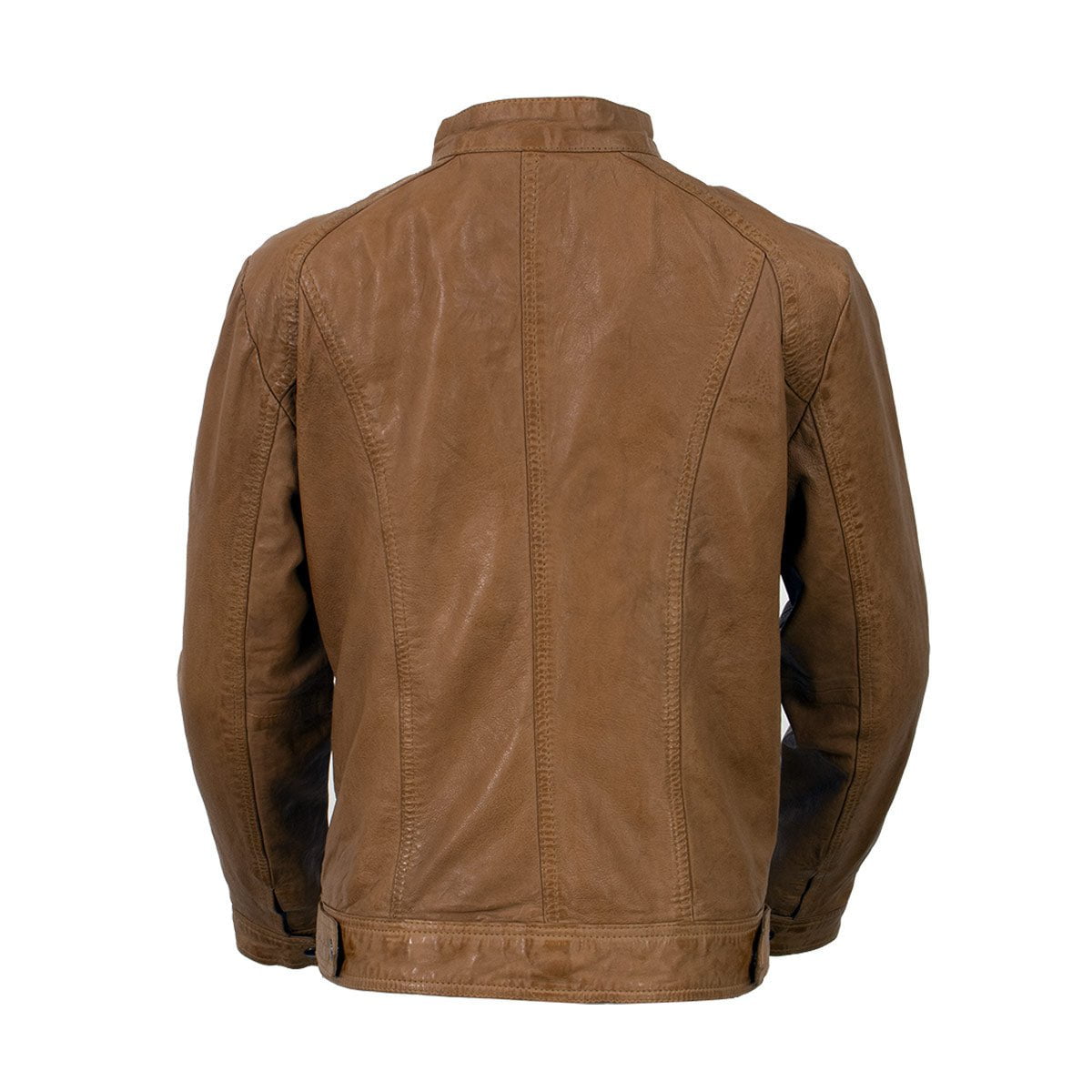 This vintage-inspired women's biker jacket adds rugged charm to any outfit. Rich cognac leather with a weathered finish creates lived-in appeal. Features include an asymmetrical zip front, notched lapels, and zippered pockets for authentic moto style. Versatile and timeless, this jacket pairs well with jeans or dresses for a touch of edgy sophistication in any season.